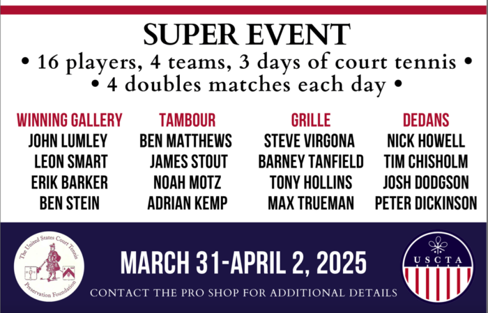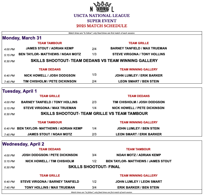 The U.S. Super League Event commences on the 31st March through 2nd April. There is a ‘foreigner’ playing too in the form of the U.K.’s Ben Taylor-Matthews. The teams and schedules below: